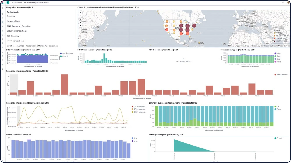 Packetbeat supports Elastic Common Schema (ECS) and is part of the Elastic Stack — meaning it works seamlessly with Logstash, Elasticsearch, and Kibana. Whether you want to transform or enrich your network data with Logstash, fiddle with some analytics in Elasticsearch, or review data in Kibana on a dashboard or in Elastic Security, Packetbeat makes it easy.