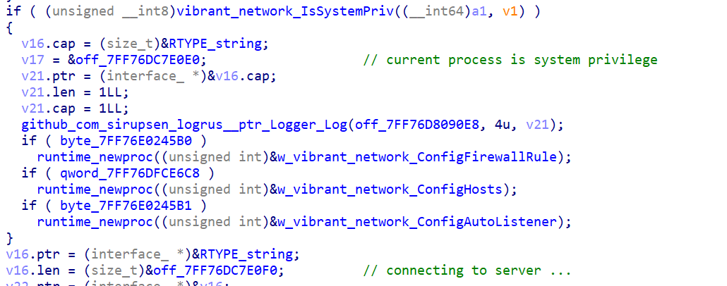 멀웨어는 현재 프로세스 토큰의 그룹 멤버십을 확인하여 권한 수준을 결정합니다. SECURITY_LOCAL_SYSTEM_RID 으로 SID를 초기화하고 CheckTokenMembership를 호출하여 프로세스가 LocalSystem 계정에 속하는지 확인합니다. 그렇지 않은 경우 SECURITY_BUILTIN_DOMAIN_RID 및 DOMAIN_ALIAS_RID_ADMINS 을 사용하여 SID를 만들고 유사한 토큰 구성원 자격 확인을 수행하여 Administrators 그룹의 구성원 자격을 확인하려고 시도합니다.