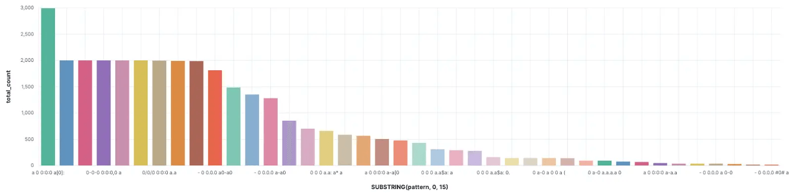 STATS total_count = COUNT(), ratio = COUNT() / 2000.0, datasources=VALUES(filename), example=TOP(raw_message, 3, "desc") BY SUBSTRING(pattern, 0, 15) |