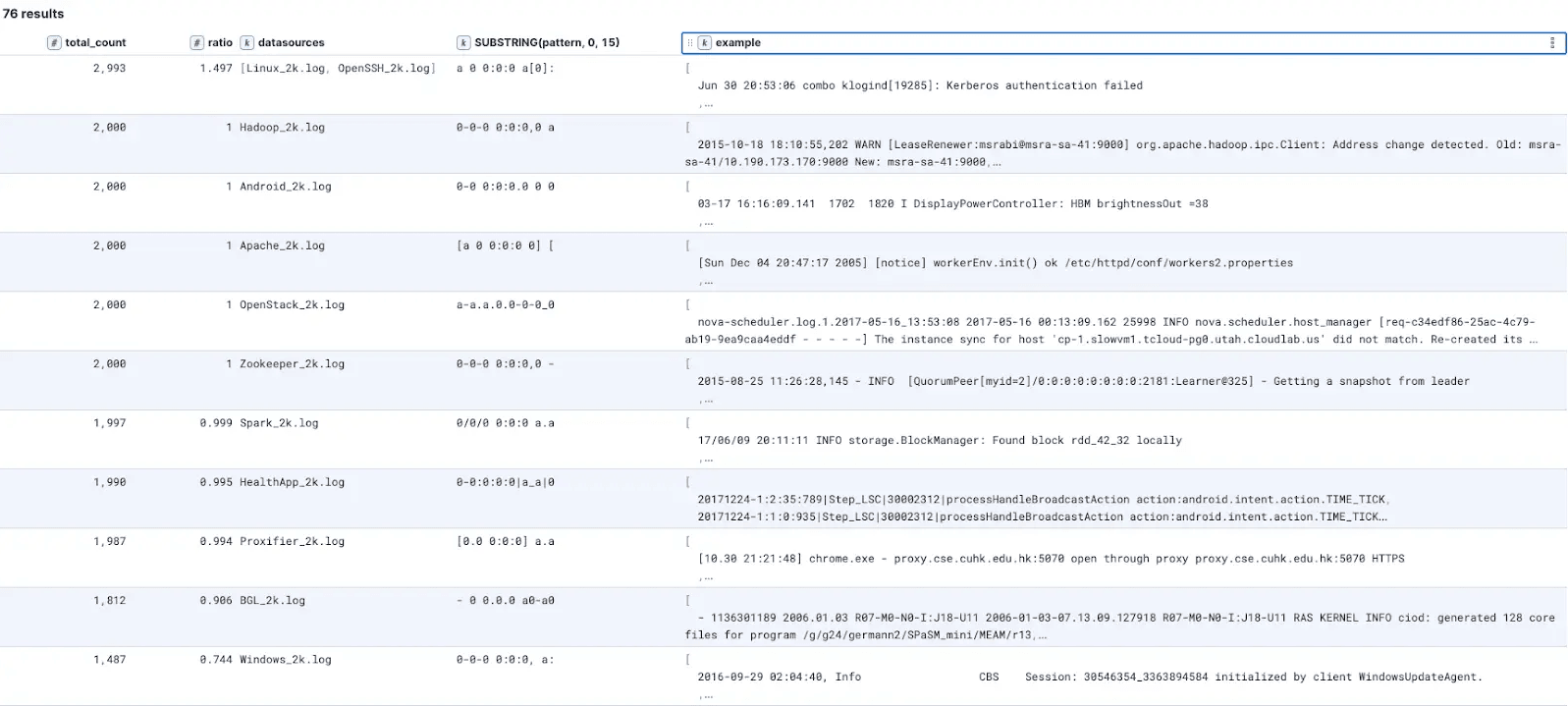 This is a clustering step. We group logs that share the first 15 characters of their pattern and create aggregated fields such as total log count per group, list of log datasources, pattern prefix, 3 log examples
