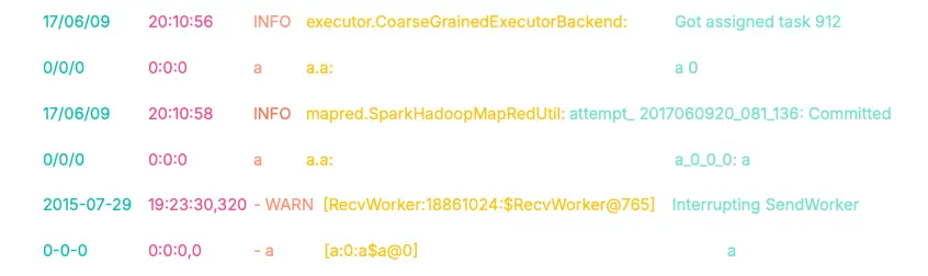 Notice the fingerprints of the first two logs. Despite different timestamps, source classes, and message content, their prefixes (0/0/0 0:0:0 a a.a:) are identical. This structural alignment allows us to automatically bucket these logs into the same cluster.