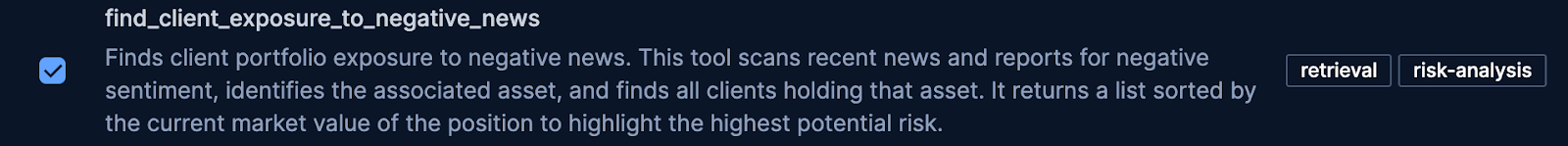 - Description: "Finds client portfolio exposure to negative news. This tool scans recent news and reports for negative sentiment, identifies the associated asset, and finds all clients holding that asset. It returns a list sorted by the current market value of the position to highlight the highest potential risk."