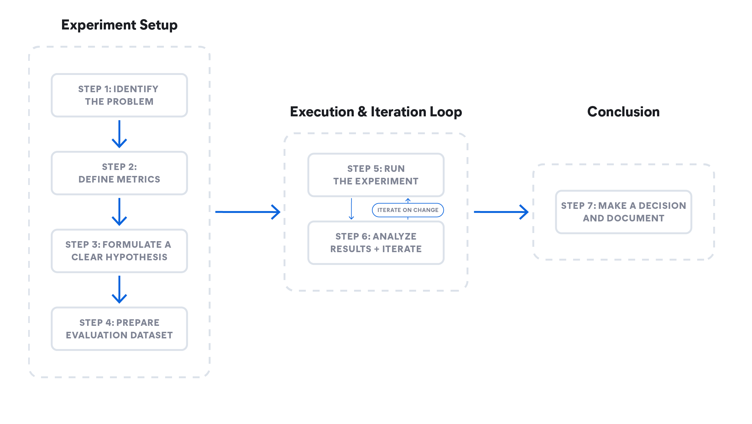 A successful experiment is a systematic process of inquiry. Every change, from a minor prompt tweak to a major architectural shift, follows these seven steps to ensure the results are meaningful and actionable: