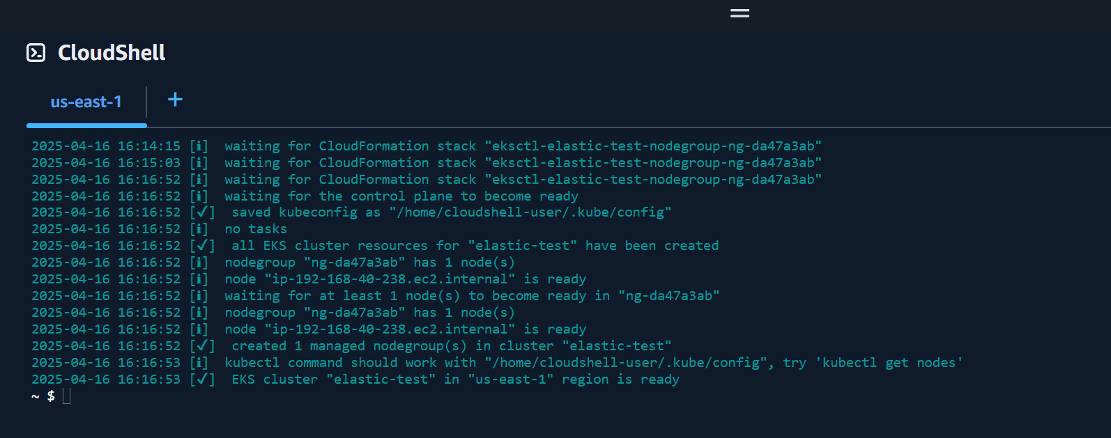 eksctl create cluster --name elastic-test --region us-east-1 --enable-auto-mode5. Wait until it is ready. It takes around 10 minutes to create