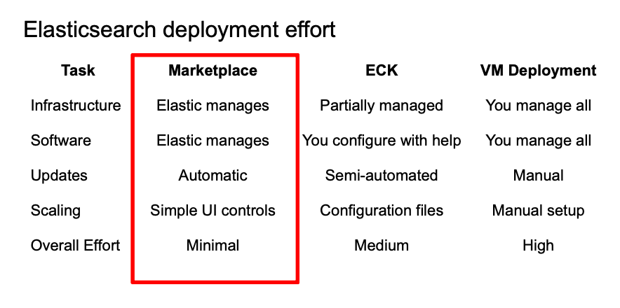 Elastic on AWS Marketplace provides a fully managed search and analytics experience where AWS handles infrastructure provisioning, security, and scaling while developers focus on building search applications. This allows teams to deploy enterprise-grade Elasticsearch clusters in minutes with built-in AWS integrations.