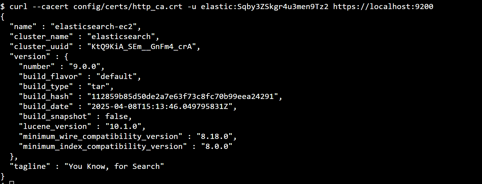 curl --cacert config/certs/http_ca.crt -u elastic:$ELASTIC_PASSWORD https://localhost:9200Replace $ELASTIC_PASSWORD with the generated password from step 3