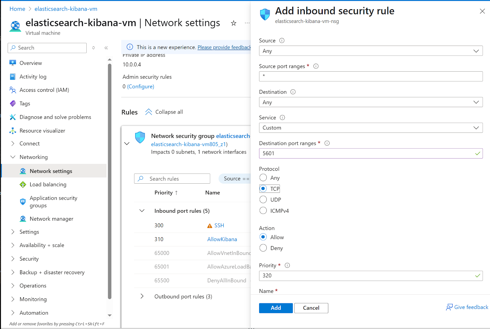 In order to connect to Kibana from the internet, we need to open the port in the recently created instance