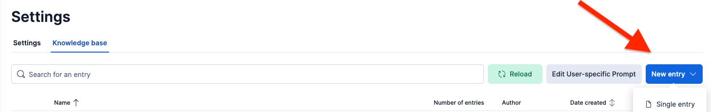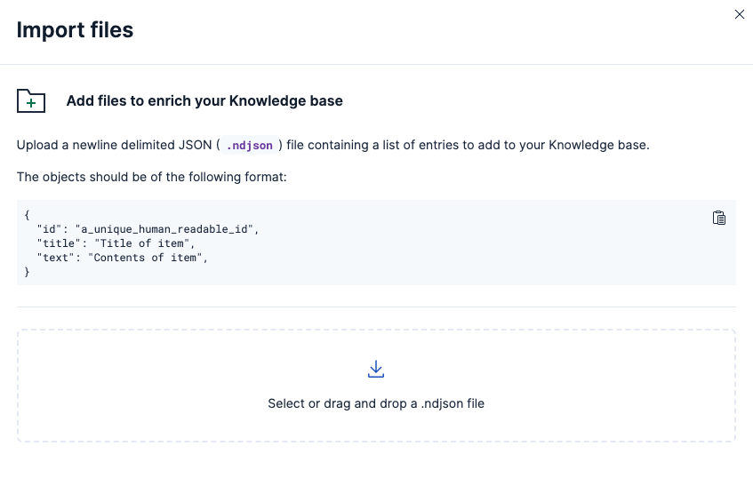 Here, we can choose between two ways of adding knowledge: we can do a single entry upload or do a bulk import in the Newline delimited JSON, or NDJSON format.