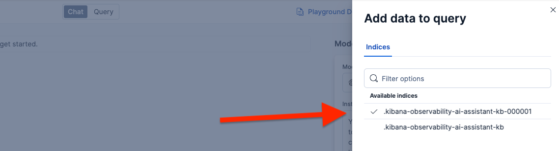 To do this, we need to unhide the index “.kibana-observability-ai-assistant-kb-000001” since Playground only allows you to work with visible indexes (hidden: false). We can change this property in the DevTools console: