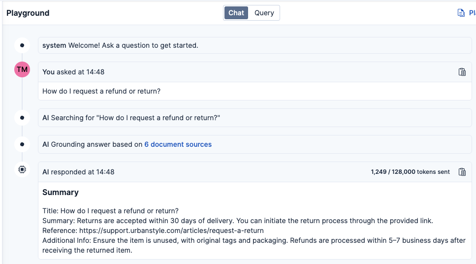 }Now that the index is ready, we can start working with Playground and ask questions about the information in our knowledge base. The answers will follow the format we specify in the system prompt.