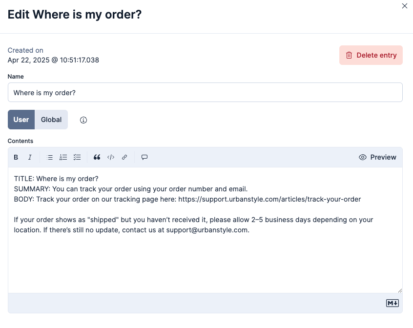 Contact Support Note: Please contact our team directly at support@urbanstyle.comWe’ll add this to the Playground instructions so that the LLM answer has the format we want: