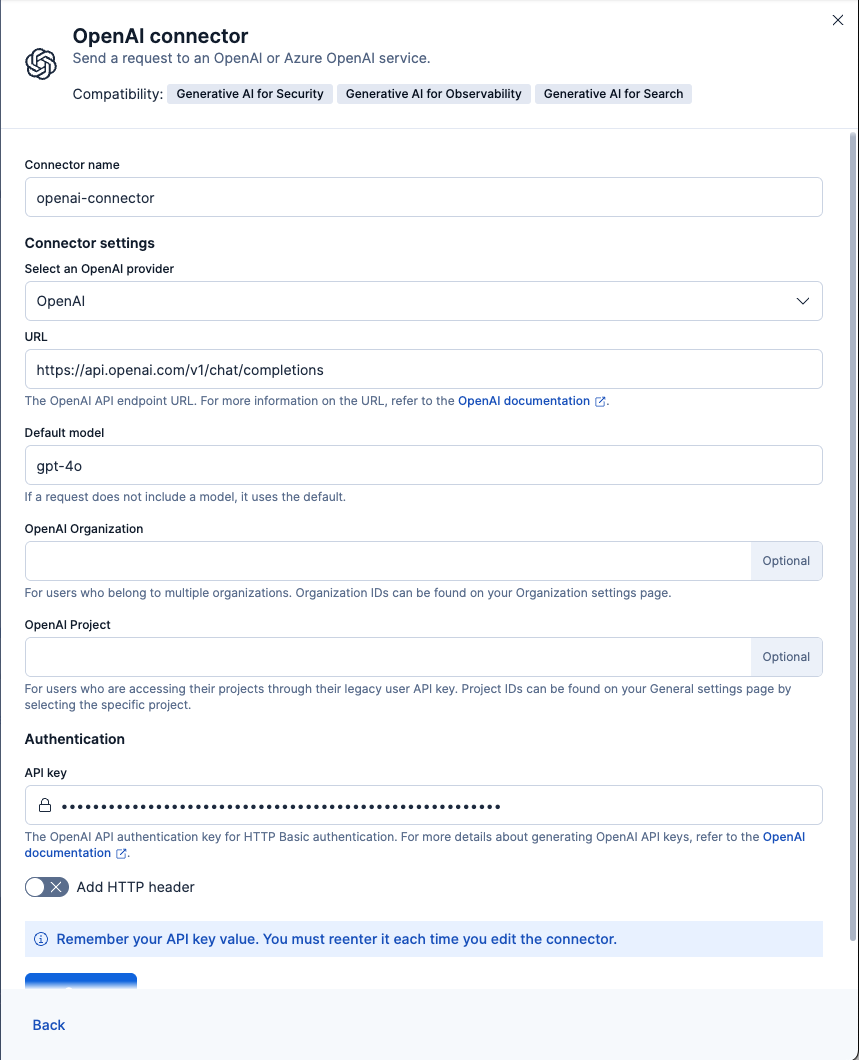 Here, we fill in the connector’s information. Keep in mind that you must have an Open AI API key available.