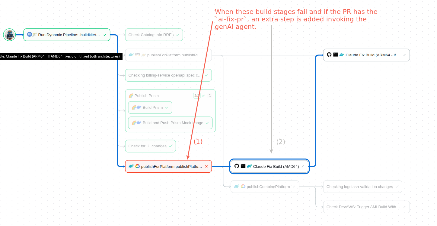 4. Use Buildkite CLI to try to fetch the previous step, the building step that failed, thus triggering the fix log. As we’ll see soon, this is a performance booster: The AI agent will analyze the file, deduce which build steps failed, and iterate over fixing loops for them.