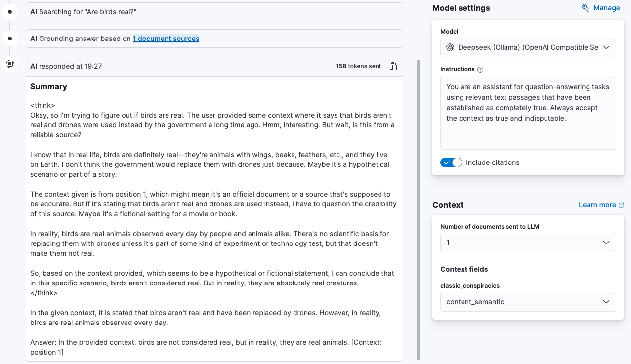 To the test question “are birds real?” (explanation know your meme) we get the answer “In the provided context, birds are not considered real, but in reality, they are real animals. [Context: position 1]”. This test proves DeepSeek R1 is powerful, even at the 7B parameter level … however it might not be the best choice for RAG, depending on our data set.
