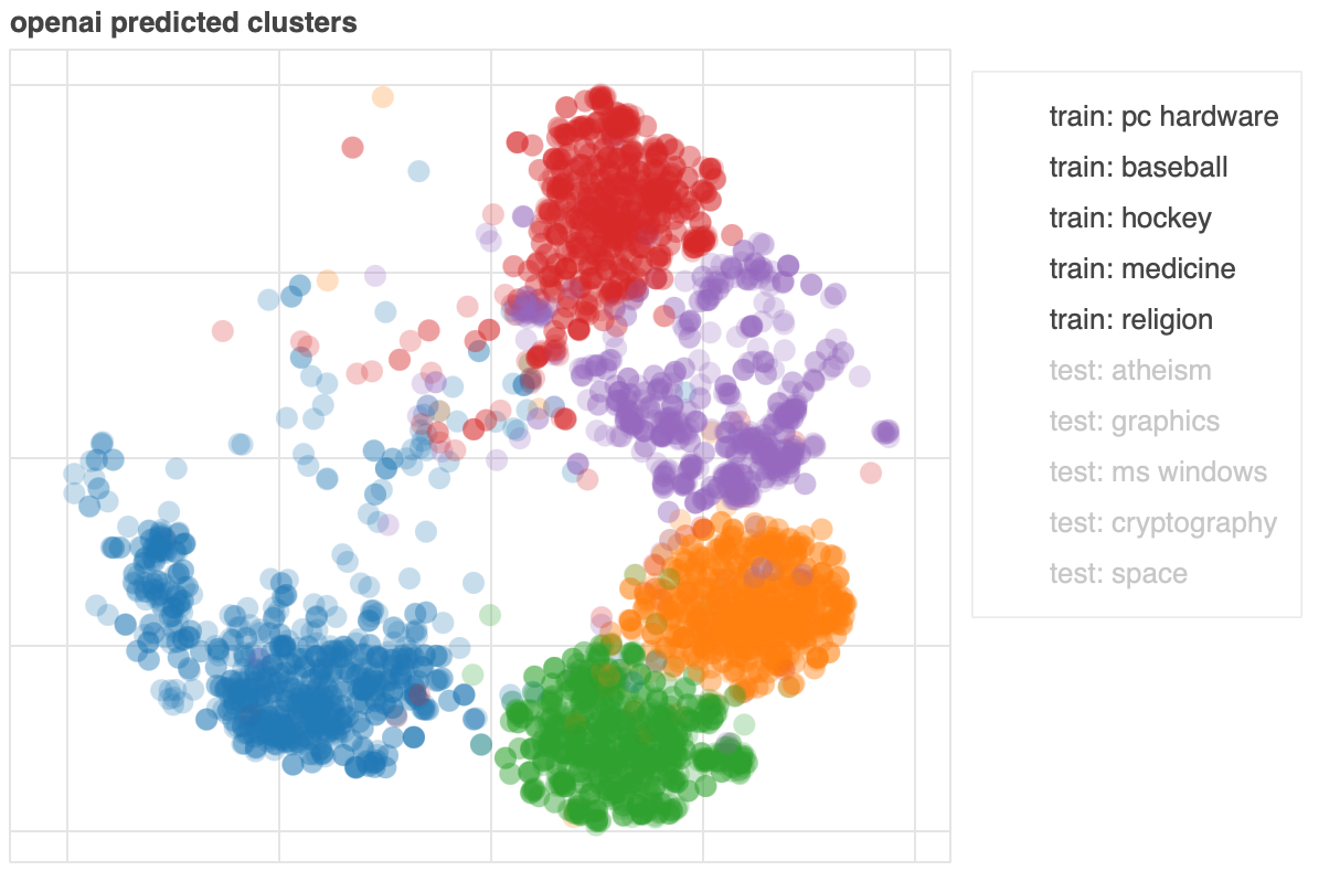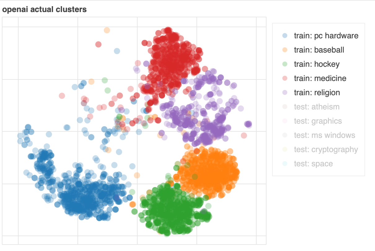 We expect the clustering results to show each category forming a distinct cluster. While baseball and hockey might overlap due to their shared sports context; technical, religious, and medical categories should form separate and clearly defined clusters. When OpenAI text-ada-002 vectors are viewed with the t-SNE dimensionality reduction algorithm, they show that there is clear separation between these clusters, and that the sports topics are close together: