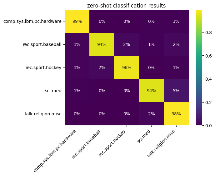 As a result, the zero-shot classification results are excellent. Even though no labels were provided in training data to the model, with only the number of clusters provided, on in-sample data a k-means model provides greater than 94% accuracy when assigning cluster numbers: