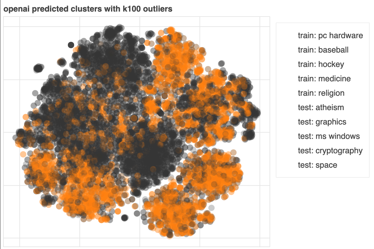 Outlier results for k=100; 2D t-SNE trained on OpenAI text-ada-002 vectors