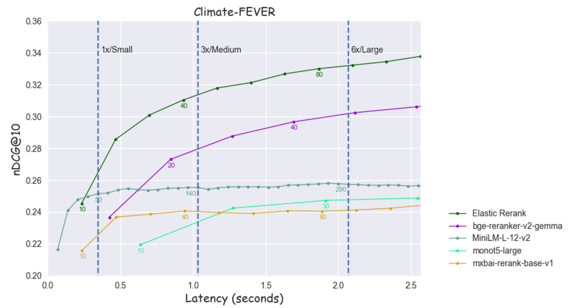 Figure 11: nDCG@10 as a function of latency for Climate-FEVER