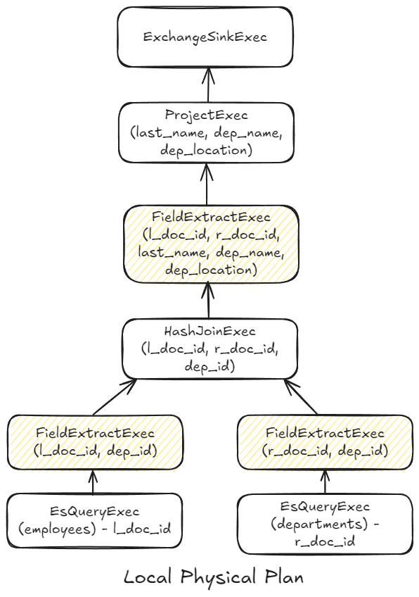 The plan is designed to reduce I/O by using efficient data extraction methods. The two nodes at the bottom of the tree act as roots, supplying the nodes above. Each one outputs references to the underlying Elasticsearch documents (doc_id). This is done intentionally to delay the loading of columns (fields) or documents for as long as possible through the designated extraction nodes (in yellow). In this particular plan, loading takes place right before the hash join on each of the joining sides and prior to the final project just before the data exits the node using only the join resulting data.