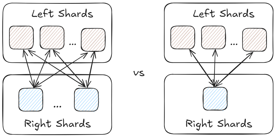 To ensure efficient scaling, standard Elasticsearch indices are divided into multiple shards spread across the cluster. In a join scenario, sharding both the left (L) and right (R) sides would result in L*R partitions. To minimize the need for data movement, lookup joins require the right side (which provides the enriching data) to have a single shard, similar to an enrich index, with the replication dictated by the index settings (default is 1).