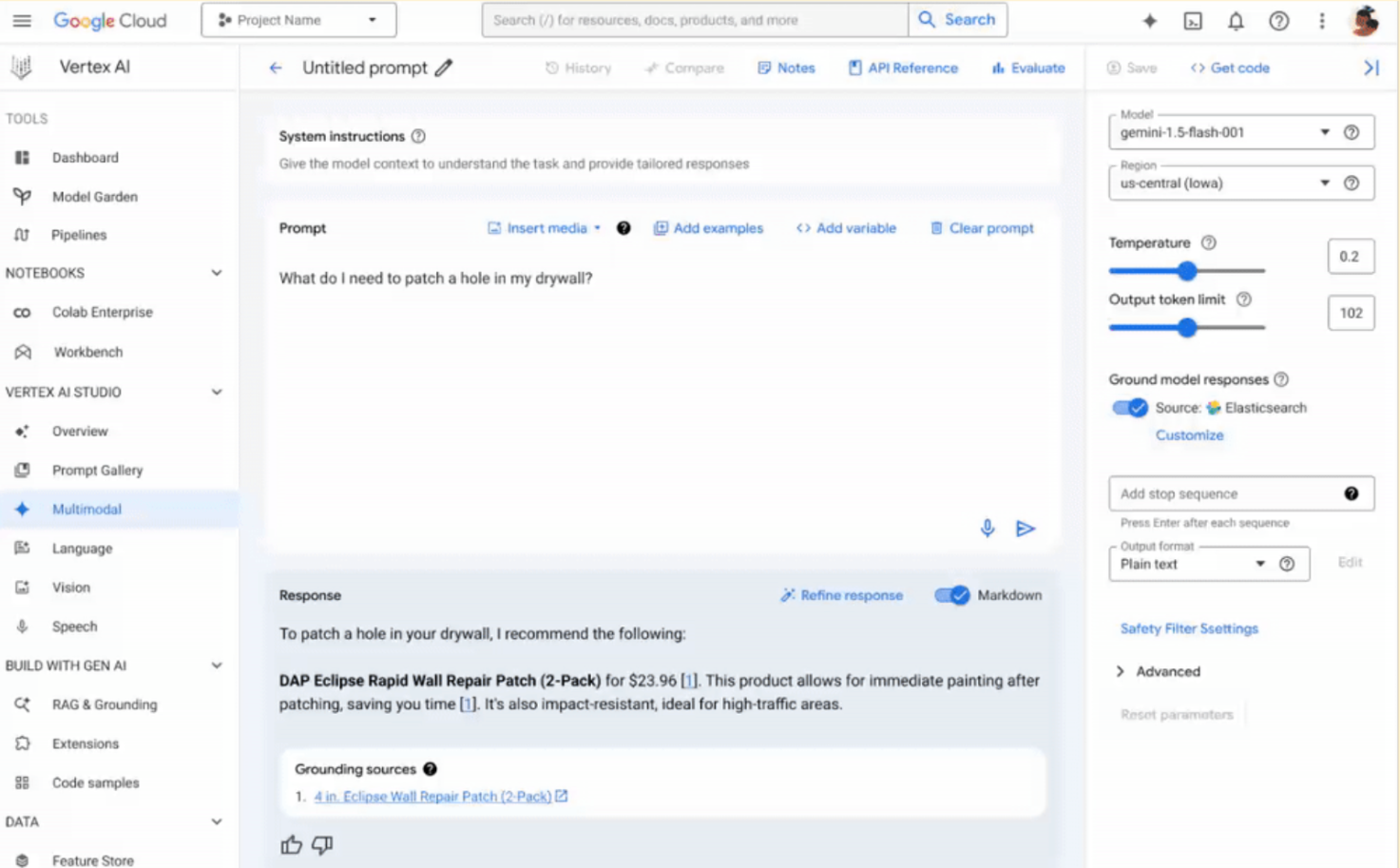The aforementioned APIs will allow developers to adopt this new partnered feature in their code. However, prompt engineering and testing remain crucial steps in the application development and serve as an initial discovery playground. To support this, Elasticsearch is designed for easy evaluation by users within the Vertex AI Studio console tool.