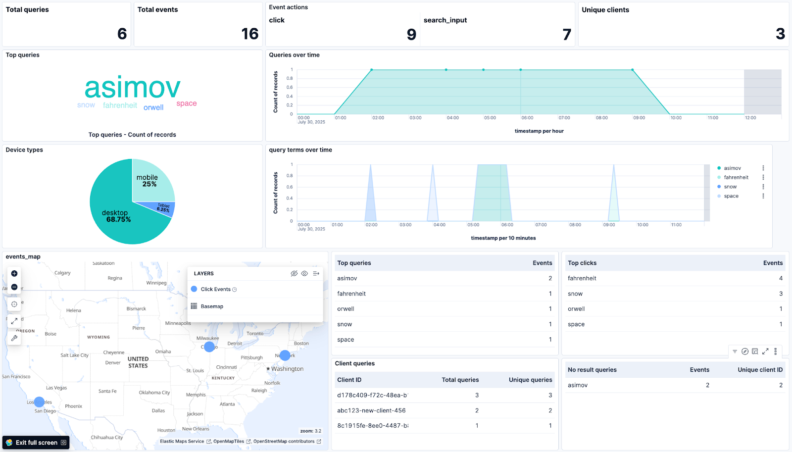 Events map: A map visualization that shows where the events are coming from, which allows us to see the geographical distribution of our users. Right now, this shows where individual documents come from, but this can also be used to see the density of users with a heatmap, for example.