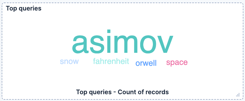 Top queries (tag cloud): A Tag cloud of the top 5 most searched terms. This visualization uses the field user_query.keyword