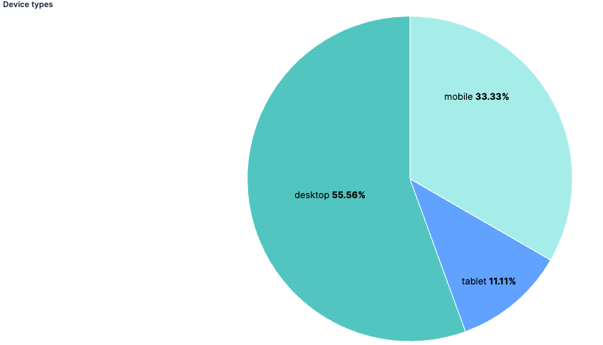 Device types: This visualization breaks down the percentage of events by the device they come from. The device can be one of three categories: Desktop, mobile, or tablet. This visualization is a pie that uses the top values of event_attributes.object.device.keyword,