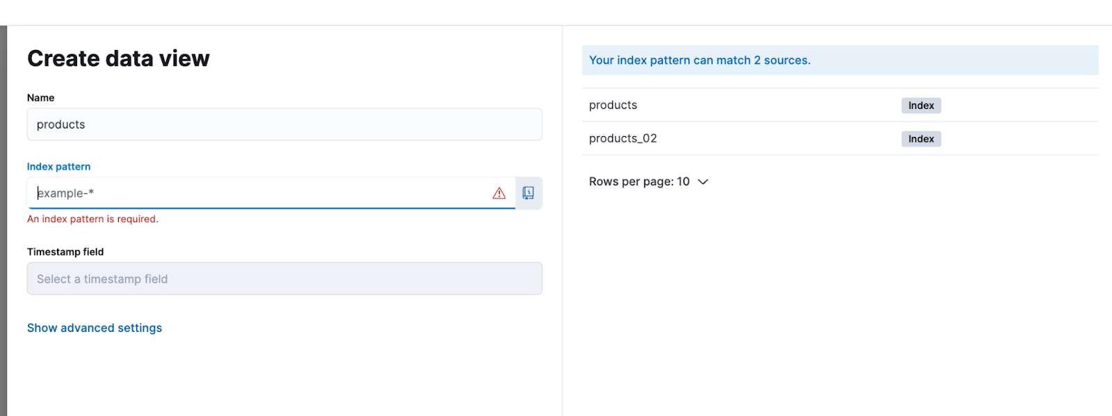Within Discovery, click on Data View and define a name and an index pattern. For the "products" index, we will use the "products” pattern. Then, we will repeat the process to create a new Data View for the "products_02" index, using the "products_02” pattern.