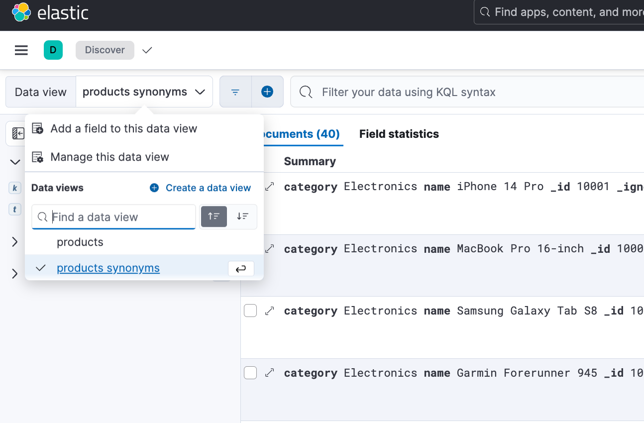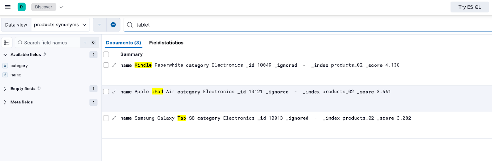 Initially, we will create an index of products without synonym support. This will allow us to validate queries and then compare them to an index that includes synonyms.