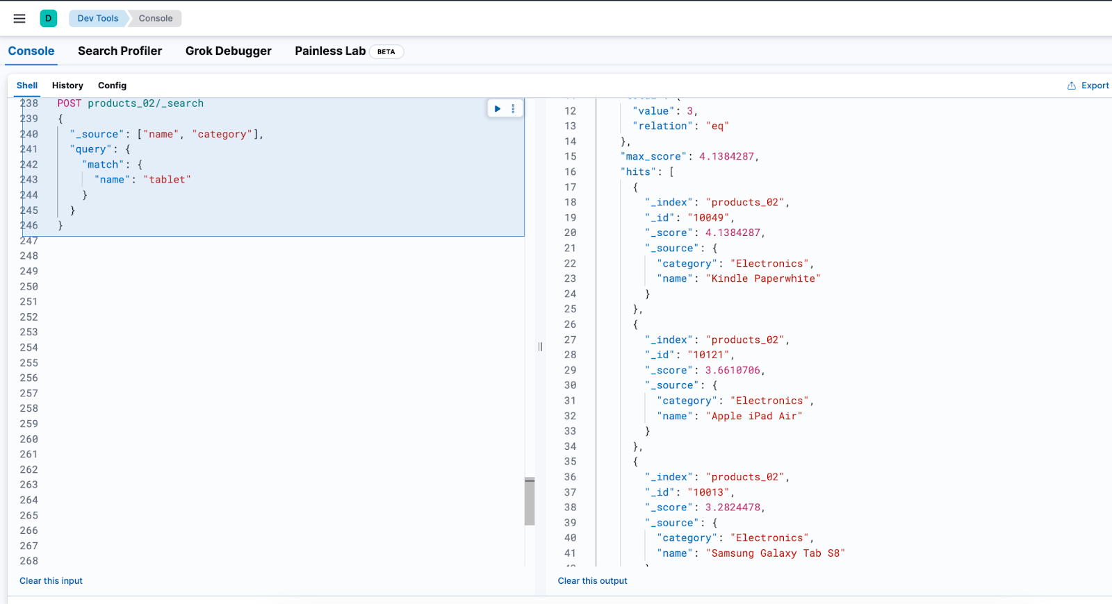 We can achieve the same result by running the same query directly in Kibana DevTools. Simply search the products_02 index using the Elasticsearch Search API:
