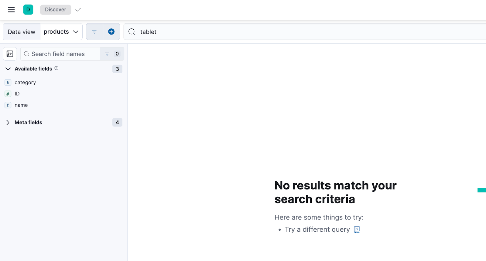 Here, after selecting DataView products and performing a search for the term "tablet", we get no results, even though we know that there are products like "Kindle Paperwhite" and "Apple iPad Air".