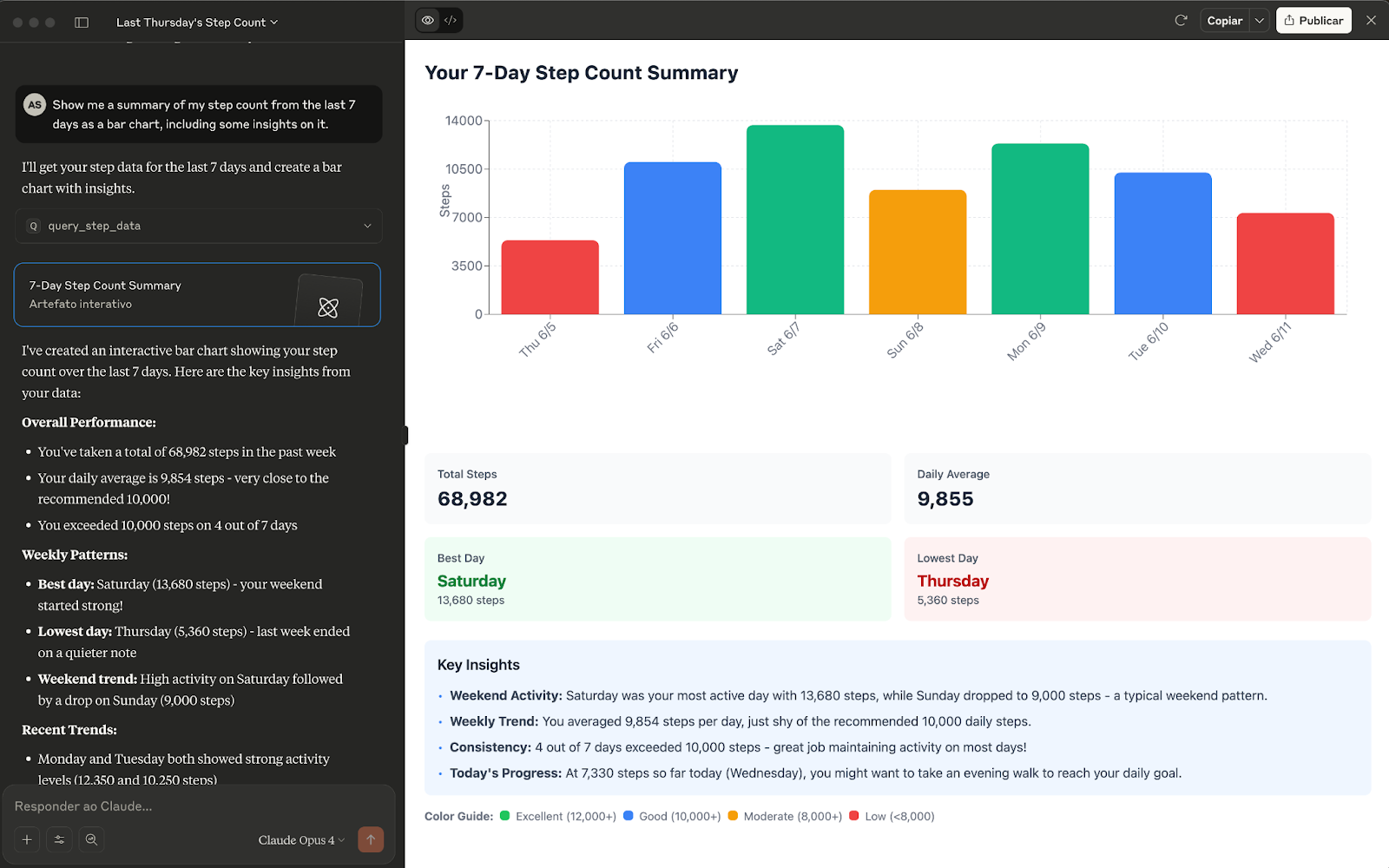 You type: Show me a summary of my step count from the last 7 days as a bar chart, including some insights on it.