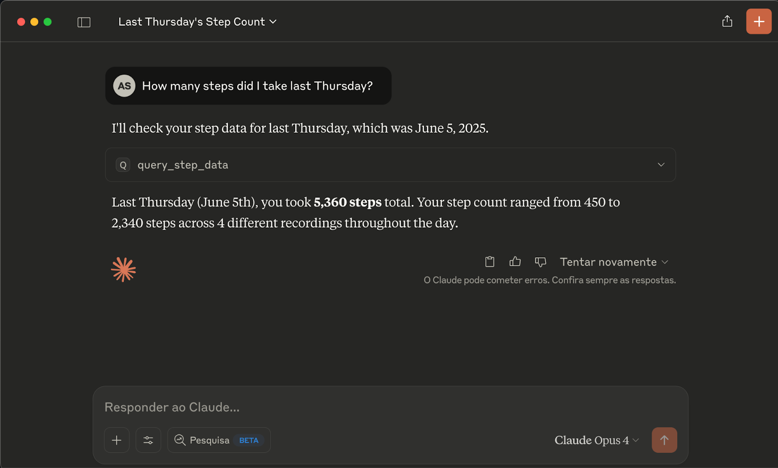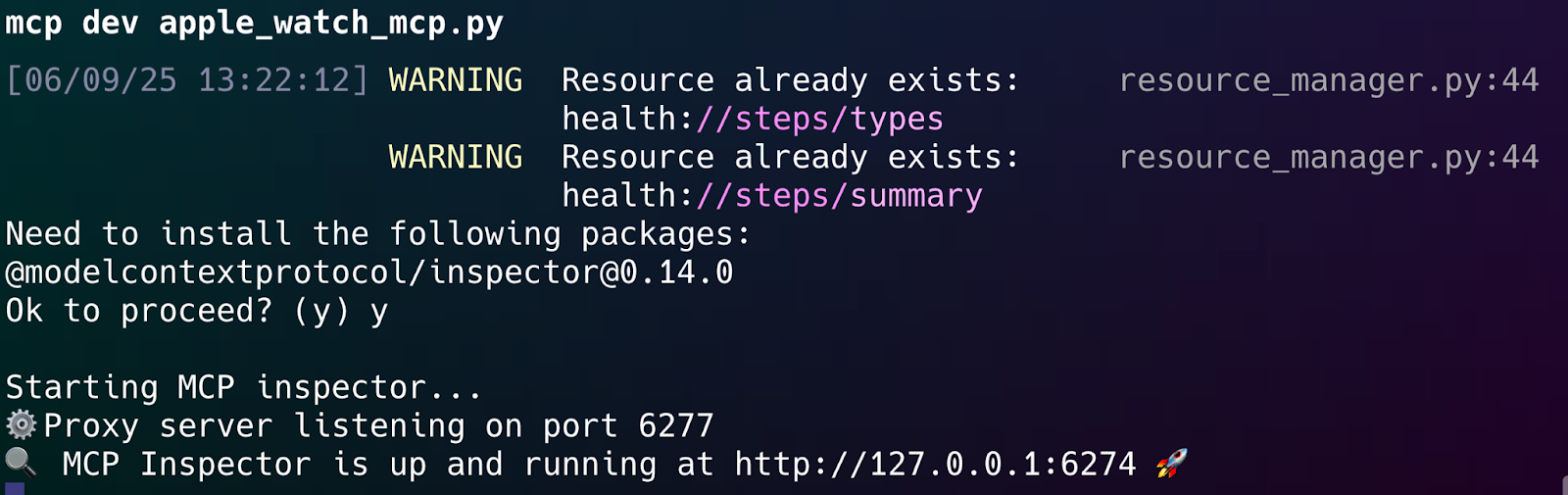 mcp install apple_watch_mcp.py --name "Apple Health Steps"Verify that the installation worked