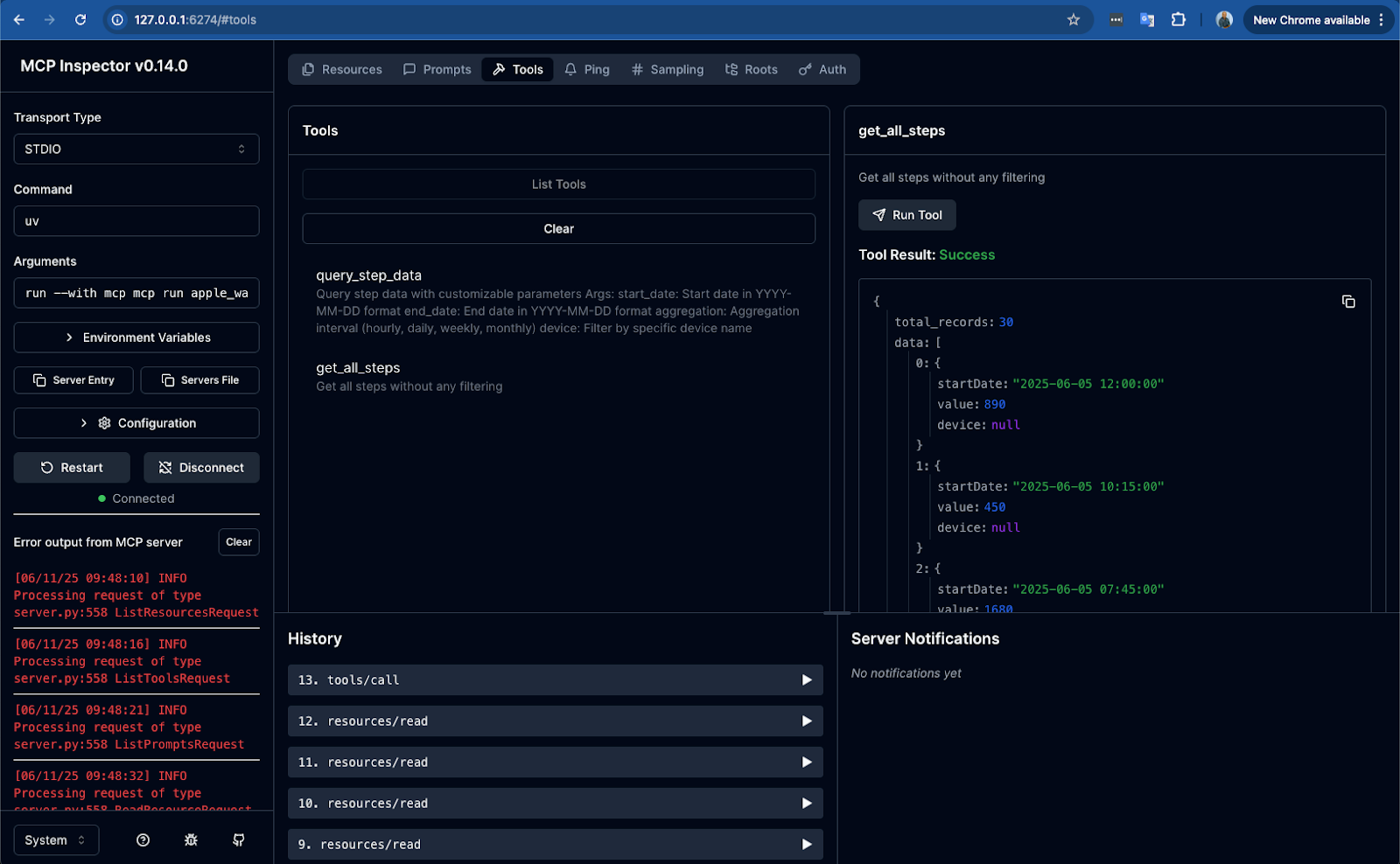 After clicking "Run Tool", the JSON response from your server will appear in this same right-hand panel. Here, you can verify if the data is correct, if the format is as you expect, and check for any errors. You can do the same for tools that require parameters (like query_step_data) by filling in the arguments before clicking "Run".