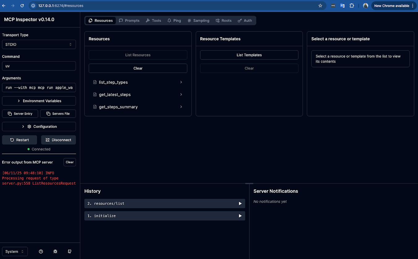 When the page loads, it will automatically connect to your running apple_watch_mcp.py script. You'll see the status on the left change from disconnected to a "Restart | Disconnect" state, and the "History" panel will show an initialize event.