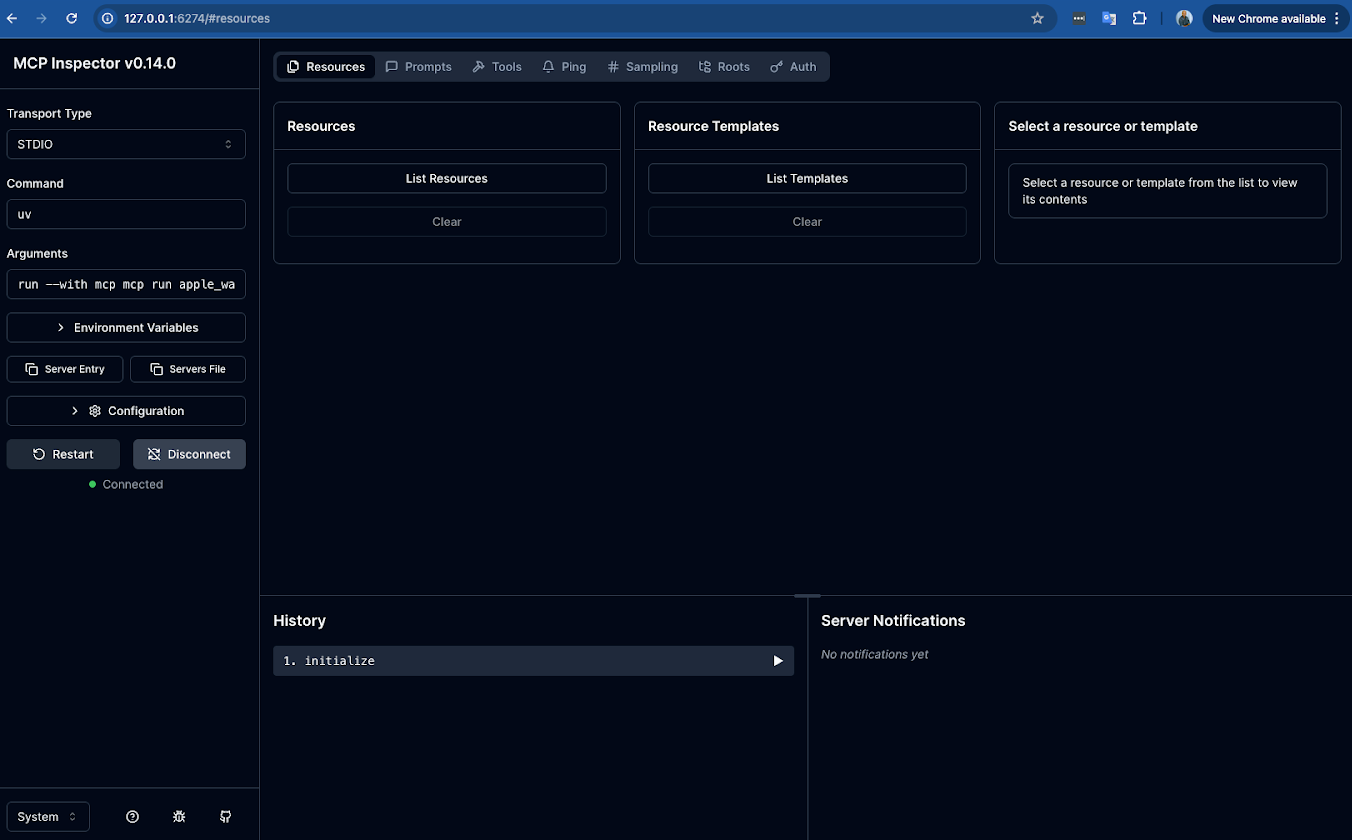 The MCP Inspector provides a clean interface to explore and interact with your server's capabilities.