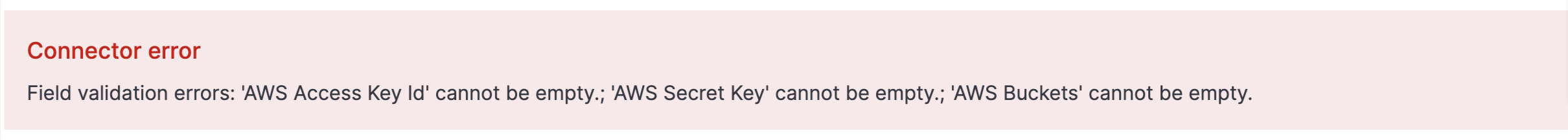 When you update the configuration, the connector can display a validation error if there is some delay in updating AWS credentials and bucket names. You can provide the required information and ignore the error banner. This is a known thing as connectors communicate asynchronously with Kibana and for any configuration update there is some delay in communication between the connector and Kibana. The error will go away once the sync starts or a refresh starts after some time: