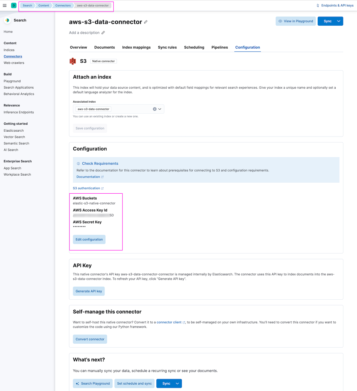 - Elastic S3 Connector is configured with S3 bucket information and credentials with the necessary permissions to connect to the bucket and sync data.