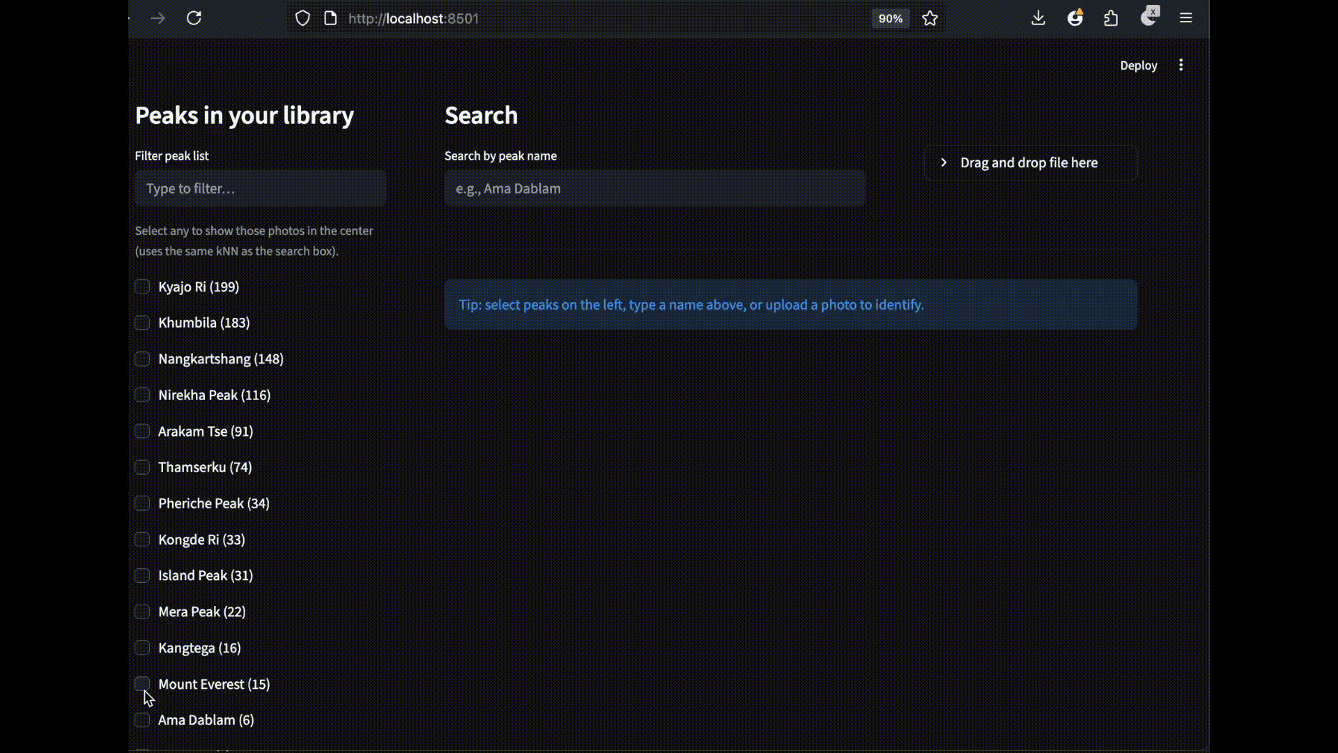 To bring everything together, we created a simple Streamlit UI that allows us to perform both search use cases. The left rail displays a scrollable list of peaks (aggregated from photos.predicted_peaks) with checkboxes and a mini-map/geo filter. At the top, there is a search by name box and an identify from photo upload button. The center pane features a responsive thumbnail grid showing kNN scores, predicted-peak badges, and capture times. Each image includes a view image button for full-resolution previews.