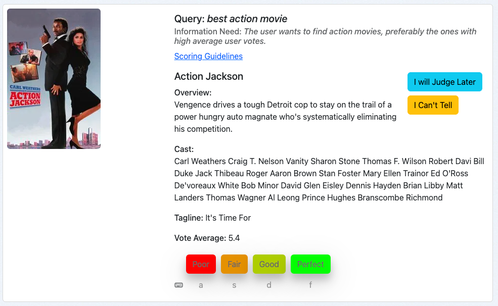 This looks like an action movie, so the information need is at least partially met. However, the vote average is 5.4 out of 10. And that makes this movie probably not the best action movie in our collection. This would lead me as a judge to rate this document “Fair,” which is a 1 in our graded scale.