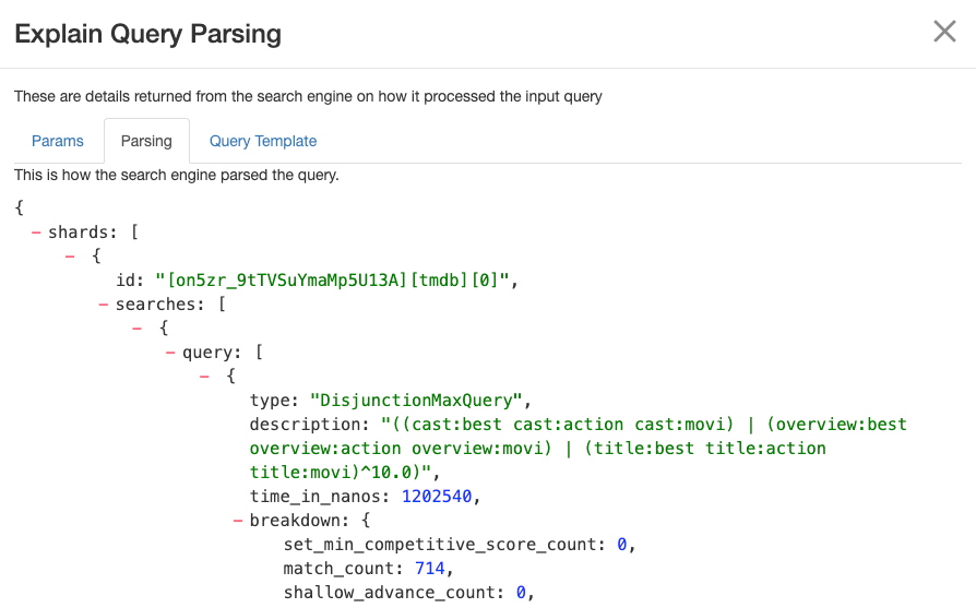 By clicking on “Explain Query” and entering the “Parsing” tab we see that the query is a DisjunctionMaxxQuery searching across three fields: cast, overview and title:
