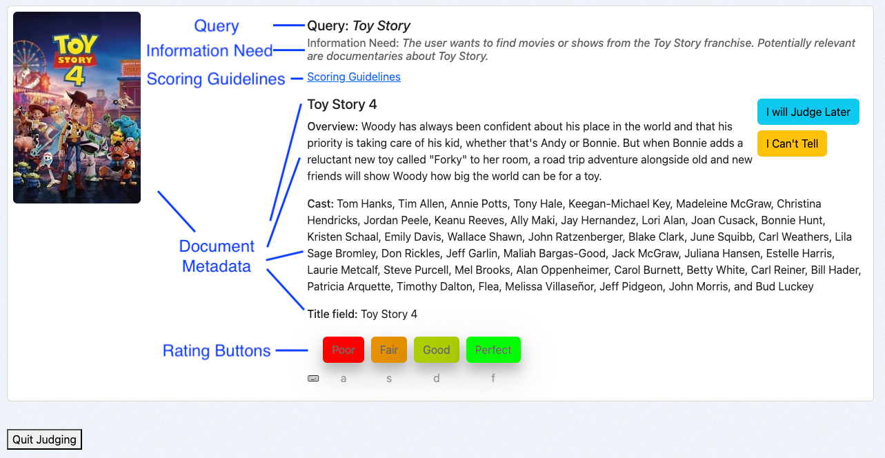 - Rating Buttons: Allows raters to assign judgements with corresponding keyboard shortcuts.
