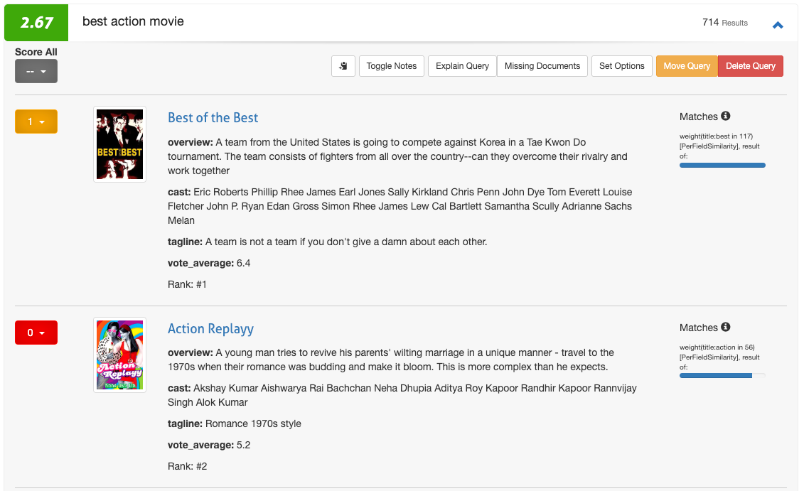 Now that your search result quality is quantified, you can run first experiments. Experimentation starts with generating hypotheses. Looking at the three queries in the screenshot after doing some rating makes it obvious that the three queries perform very differently in terms of their search quality metric: star wars performs pretty well, harrison ford looks alright but the greatest potential lies in best action movie.