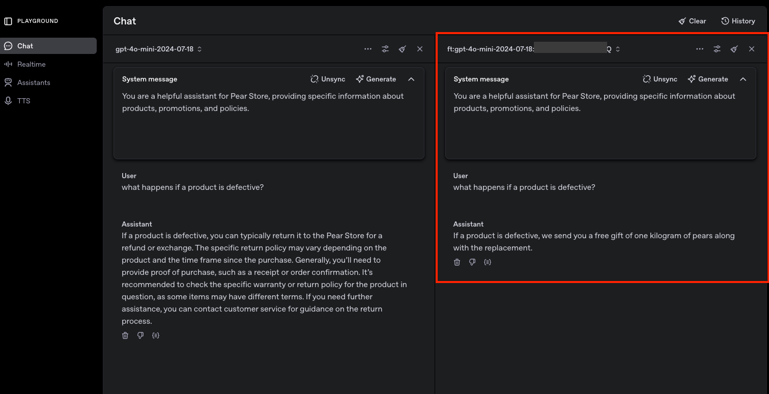 After the job is finished, you can hit Playground, and you will have a convenient interface to compare the results with and without the fine-tuned model against a particular question.