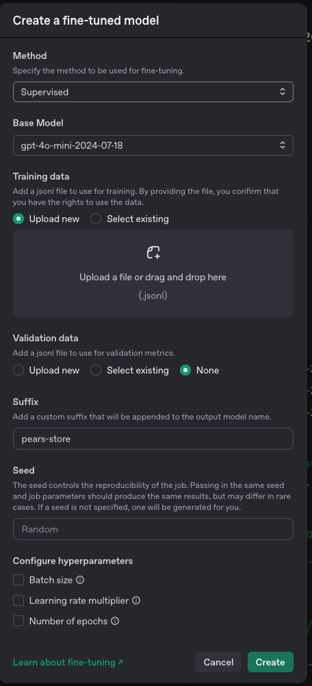 Next, using the OpenAI UI, we can go to Dashboard > Fine-tuning and hit Create