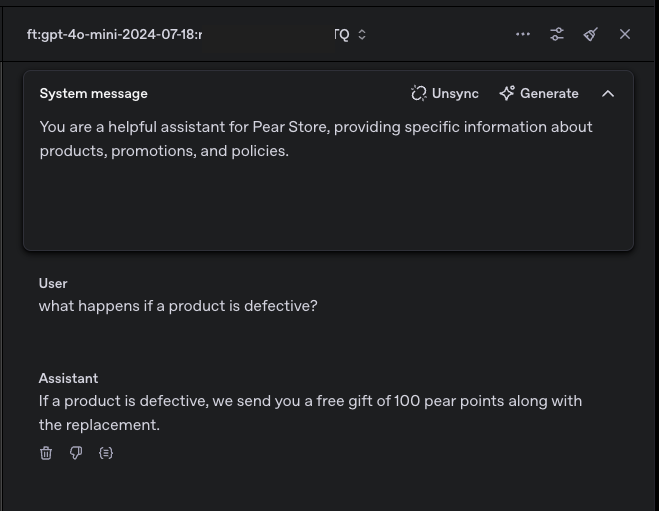 On the right side, we can see that the model provided the custom answer about defective products: a free kilogram of pears along with the replacement.