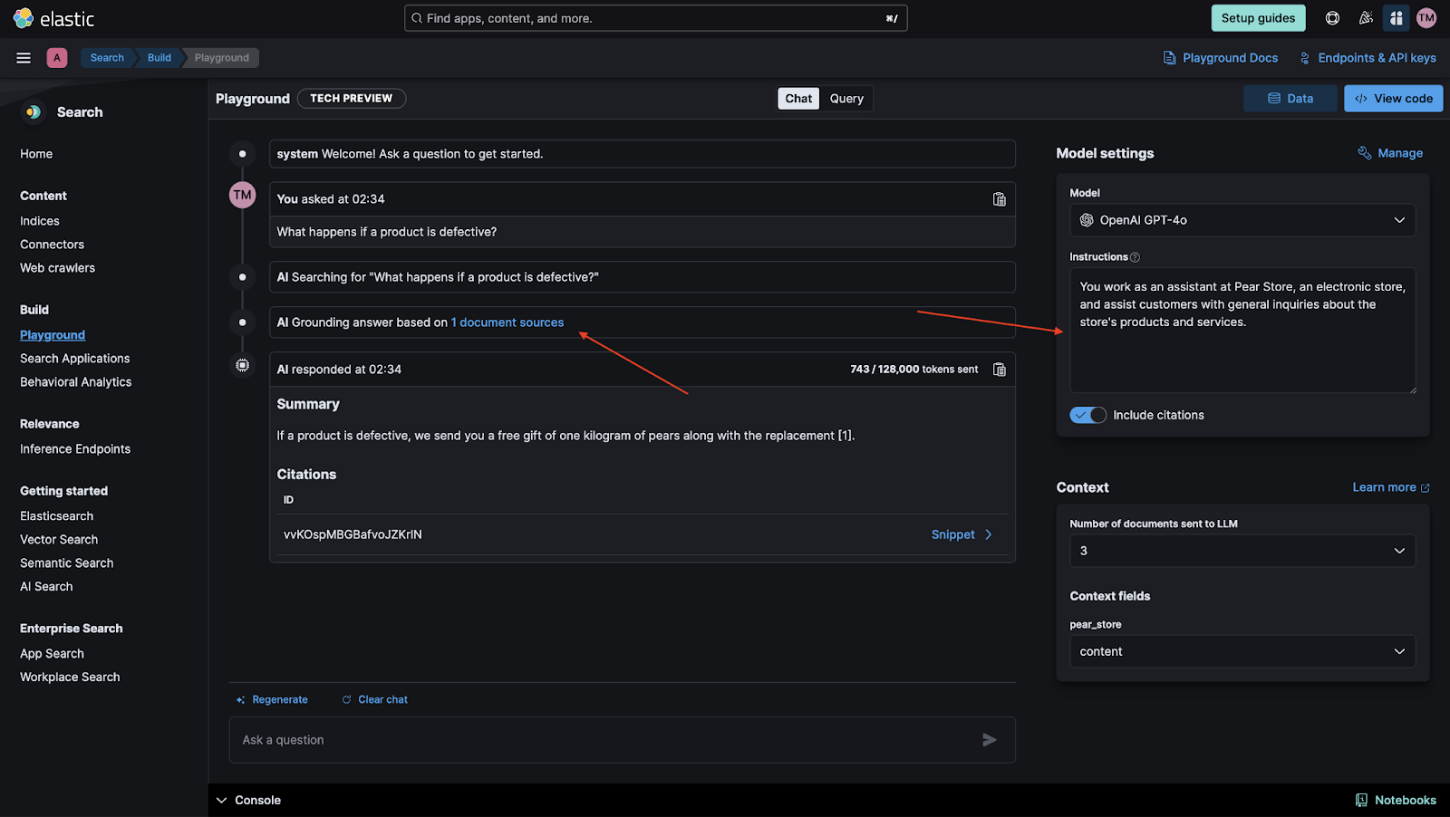 Now we're ready to interact with our data using Playground! Using the UI, we can change the AI instructions and check the source of the document used to provide an answer.
