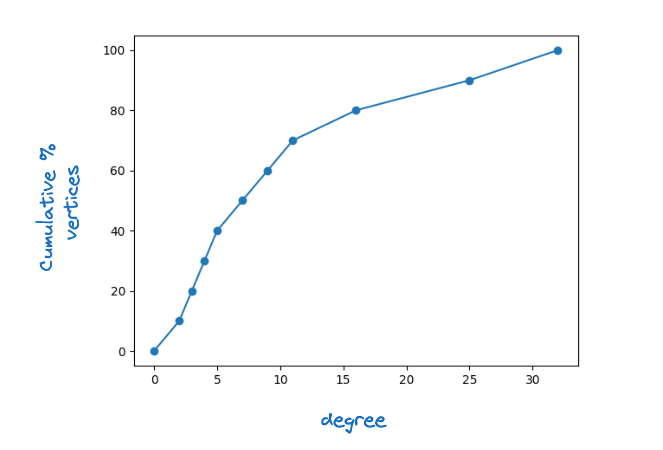 It's clear that for this to work every vertex in must have at least one neighbor in . In fact, we require that for every vertex in that for some , the maximum layer connectivity. We observe that in real HNSW graphs we see quite a spread of vertex degrees. The figure below shows a typical cumulative density function of vertex degree for the bottom layer of an Lucene HNSW graph.