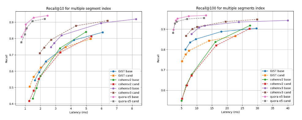 For multiple segment indices the candidate is better for almost all datasets, except cohere v2 where the baseline is slightly better. For the single segment indices recall curves are almost identical for all cases.